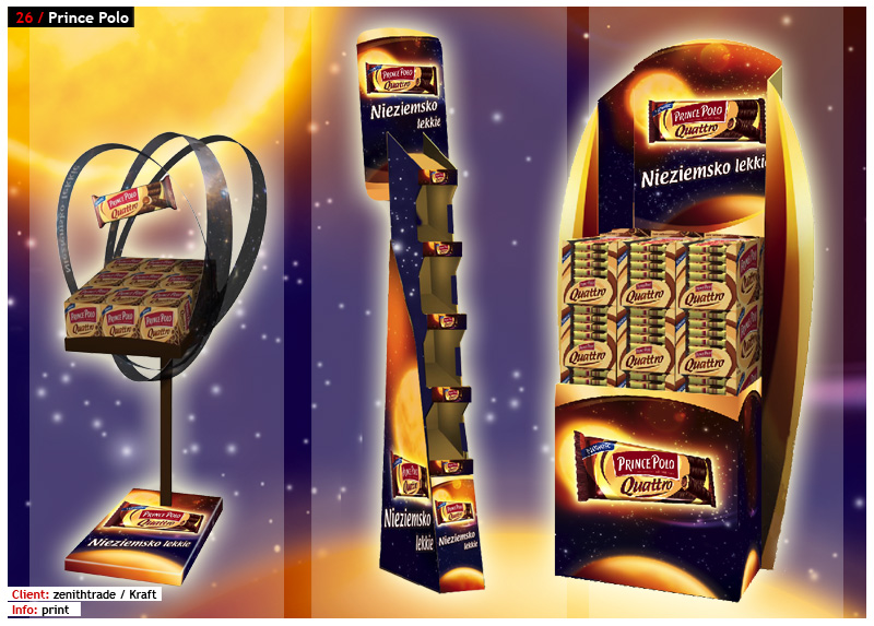 Komplet materiałów promocyjnych zaprojektowanych na potrzeby nowego wafelka Prince Polo Quattro obejmował standy sprzedażowe oraz materiały POS. Klient Zenithtrade